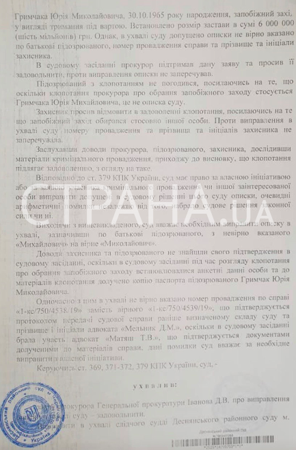 Суд исправил неправильный номер дела, фамилию и инициалы адвоката, а также отчество Грымчака (с неправильного "Михайлович" на верное "Николаевич").