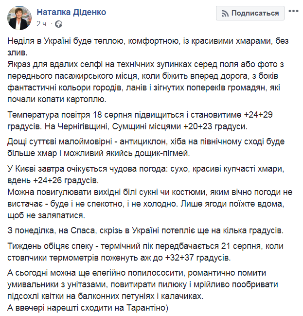 По словам Диденко, температура воздуха 18 августа составит + 24...+ 29 градусов Цельсия. На Черниговщине и Сумщине местами будет прохладнее: + 20...+ 23 градуса.