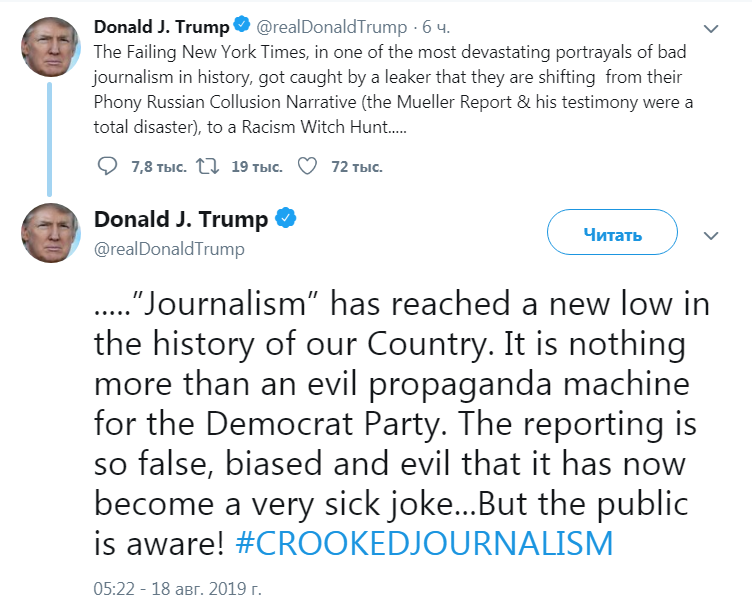 "Это (американская журналистика. - Ред.) не более чем дьявольская пропагандистская машина, работающая на Демократическую партию", - написал президент.