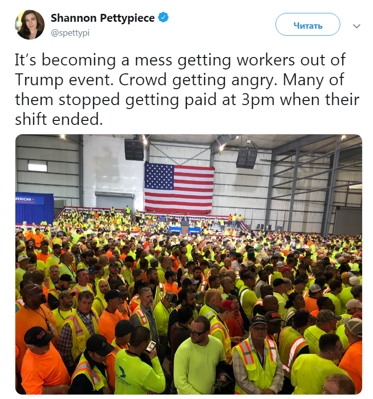 13 августа президент США Дональд Трамп выступил перед рабочими нефтехимического комбината компании Shell в штате Пенсильвания. Как сообщает газета Pittsburgh Post-Gazette, рабочих фактически принудили пойти на мероприятие угрозами.