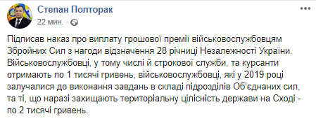 По случаю 28-й годовщины Независимости Украины военнослужащие получат денежные премии. Министр обороны Степан Полторак подписал указ и назвал суммы вознаграждения. Об этом говорится в его посте в соцсети.