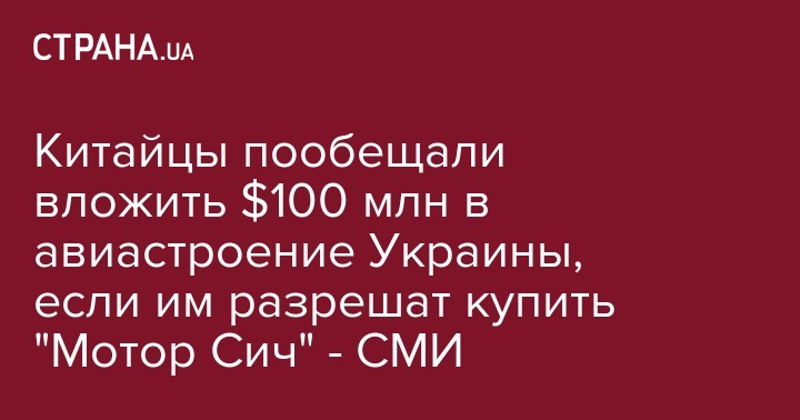 Представители компаний Skyrizon Aircraft и Xinwei Technology Group намерены предоставить авиастроительной отрасли Украины гранты на $100 млн в случае получения разрешения Антимонопольного комитета (АМКУ) на покупку более 50% акций машиностроительного завода "Мотор Сич". Об этом сообщил агентству Интерфакс-Украина информированный источник в правительстве.