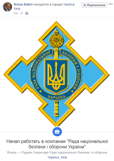 Бывший представитель президента Украины в АР Крым Борис Бабин, который занимал эту должность еще при Петре Порошенко, заявил, что он стал советником секретаря СНБО Александра Данилюка. Этой новостью Бабин поделился c подписчиками в Facebook.