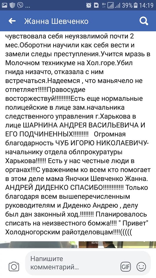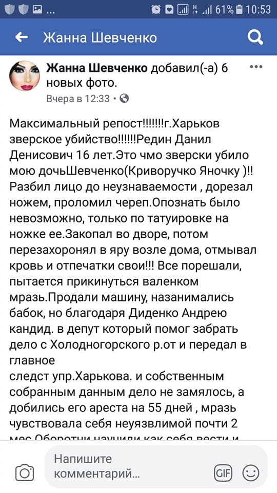 Она сообщает, что ее дочь, 26-летнюю Яну Шевченко, в конце июня убил 16-летний Даниил Редин. Женщина рассказывает, что девушка пропала 28 июня, после этого ее искали родственники, полиция и волонтеры. Спустя десять дней изувеченное тело пропавшей нашли в яру в районе Лысой горы. При этом она была настолько обезображена, что опознать ее удалось только благодаря татуировке кошки на ноге.