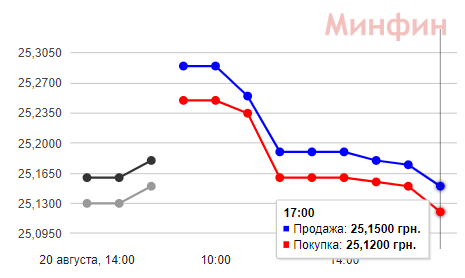 Торги на межбанке, которые влияют на курсы в банках и обменках, открылись в 10:00. 20 августа справочный курс гривны к доллару США на межбанковском валютном рынке укрепился до 25,1242 грн/$1 с 25,1883 грн/$1.