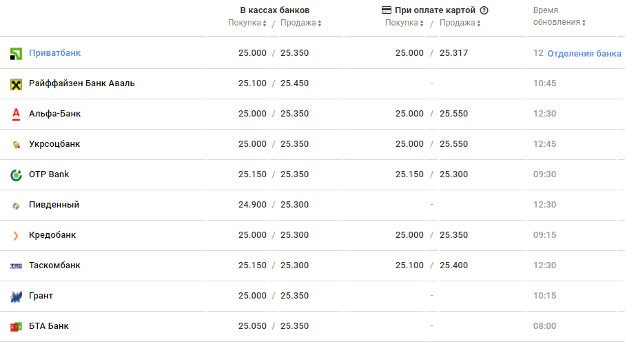 В банках курс доллара с утра был такой: покупка от 24,80 до 25,20 грн, продажа от 25,23 до 25,55 грн. В обед средний курс: 25,10 грн - покупка и 25,35 грн - продажа. В разных банках курс немного отличается.