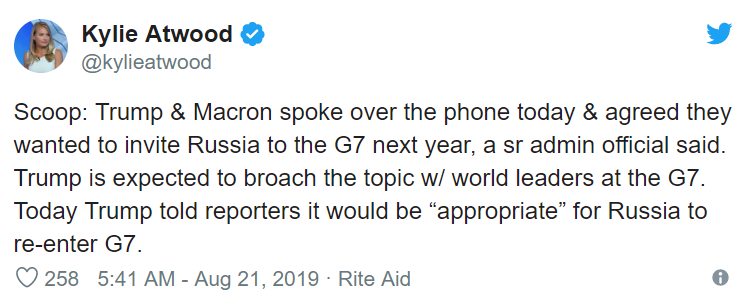 "Трамп и Макрон поговорили по телефону сегодня и согласились с тем, что они хотят пригласить Россию на G7 в следующем году, заявил представитель администрации. Ожидается, что Трамп затронет эту тему с мировыми лидерами", – написала журналистка в Twitter.