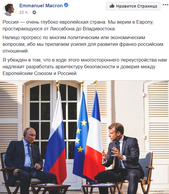 О ней он даже написал у себя в Facebook - причем на русском языке. На этот пост Макрона сильно обиделись националисты и "порохоботы", которые заговорили о зраде.