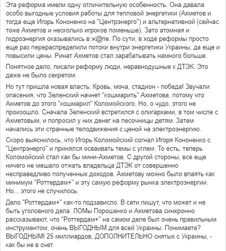 "Все бы ничего, но нетронутой осталась тепловая энергетика. А в этой отрасли, напомню, работают две крупных группы влияния. Это почти монополист Ринат Ахметов (ДТЭК) и недавно севший на схему с "Центрэнерго" Игорь Коломойский. Основной кусок тепловой энергетики, конечно, принадлежит Ахметову", - пишет Лямец.