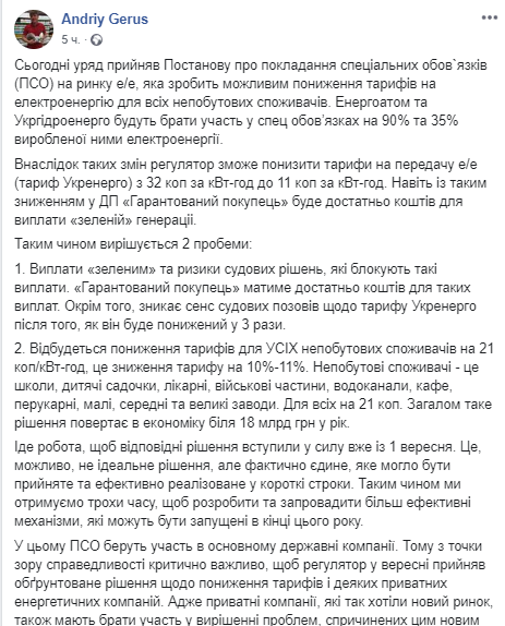 "Состоится понижение тарифов для всех небытовых потребителей на 21 коп./кВт-ч, это снижение тарифа на 10-11%. Небытовые потребители - это школы, детские сады, больницы, военные части, водоканалы, кафе, парикмахерские, малые, средние и крупные заводы. Для всех на 21 коп. В целом такое решение возвращает в экономику около 18 млрд грн в год", - написал он.