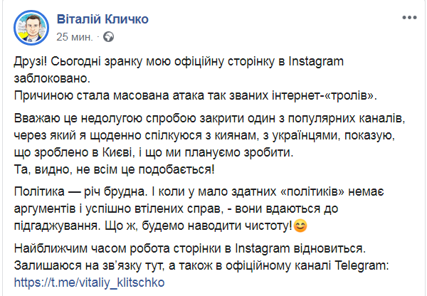 Городской голова Киева Виталий Кличко сообщил, что в четверг утром его официальную страницу в соцсети Instagram заблокировали из-за атаки интернет-троллей. Об этом он написал на своем Facebook.