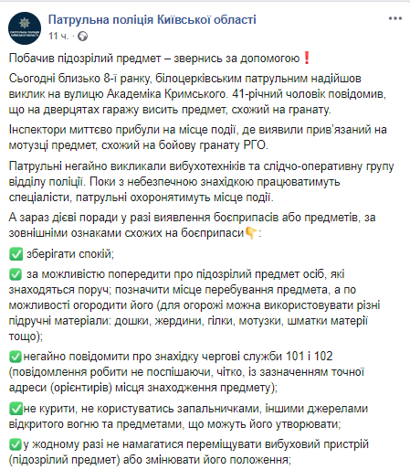 В четверг, 22 августа, около 8 утра, патрульные Белой Церкви выехали на сообщение о гранате, привязанной к двери гаража. Об этом сообщает пресс-служба патрульной полиции Киевской области в Facebook.