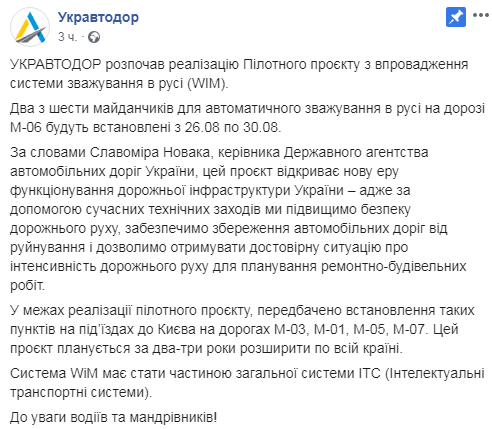 Две из шести площадок для автоматического взвешивания в движении на дороге М-06 будут установлены с 26 по 30 августа. Работы стартуют вечером на автодороге М-06 Киев-Чоп в направлении из Киева в Житомир, на комплексах WIM 1 (Киево-Святошинский район, с.Капитановка) и WIM 2 (Макаровский район, пгт.Калиновка).