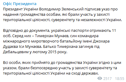 В частности, сообщается, что согласно документу, украинские паспорта получат 11 человек. Среди них - Тимерхан Мунаев, сын командира международного миротворческого батальона имени Джохара Дудаева Исы Мунаева. Отец Тимерхана погиб под Дебальцево в феврале 2015 года.