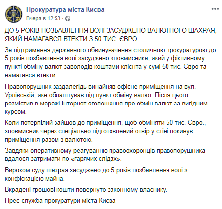 В Киеве к 5 годам лишения свободы приговорили мошенника, который обустроил фиктивный пункт обмена валют, а когда клиент принес ему 50 тысяч евро, попытался сбежать с деньгами. Об этом сообщает пресс-служба Прокуратуры Киева в Facebook.