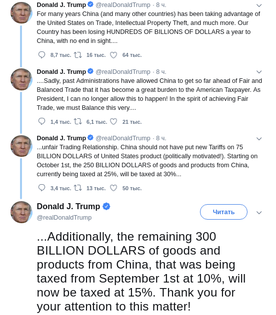 "...Наша страна теряет сотни миллиардов долларов в год, которые уходят в Китай. К сожалению, прежние администрации позволили Китаю настолько опередить справедливую и сбалансированную торговлю, что это стало большим бременем для американского налогоплательщика. Как президент, я больше не могу этого допустить! ...Китаю не следовало устанавливать новые тарифы на 75 миллиардов долларов США (политически мотивированные тарифы!). Начиная с 1 октября, 250 миллиардов долларов товаров и продуктов из Китая, которые в настоящее время облагаются налогом в 25%, будут облагаться налогом в 30%.  Оставшиеся 300 миллиардов долларов товаров и продуктов из Китая, которые облагались налогом с 1 сентября по ставке 10%, теперь будут облагаться налогом по ставке 15%. Благодарим Вас за внимание к этому вопросу!" - написал Трамп.