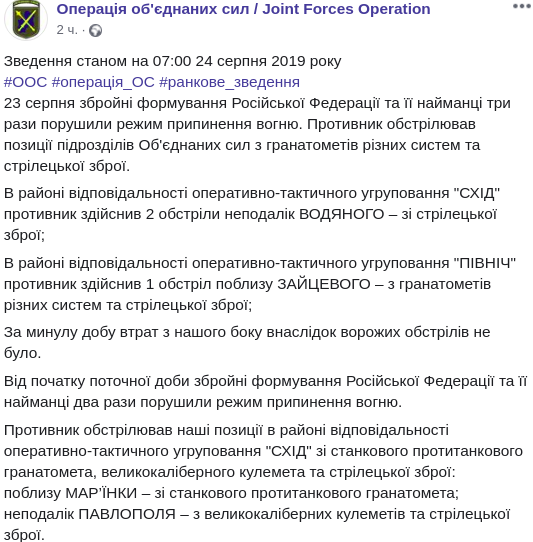 Новость сообщает пресс-центр штаба ООС в Facebook в субботу, 24 августа.