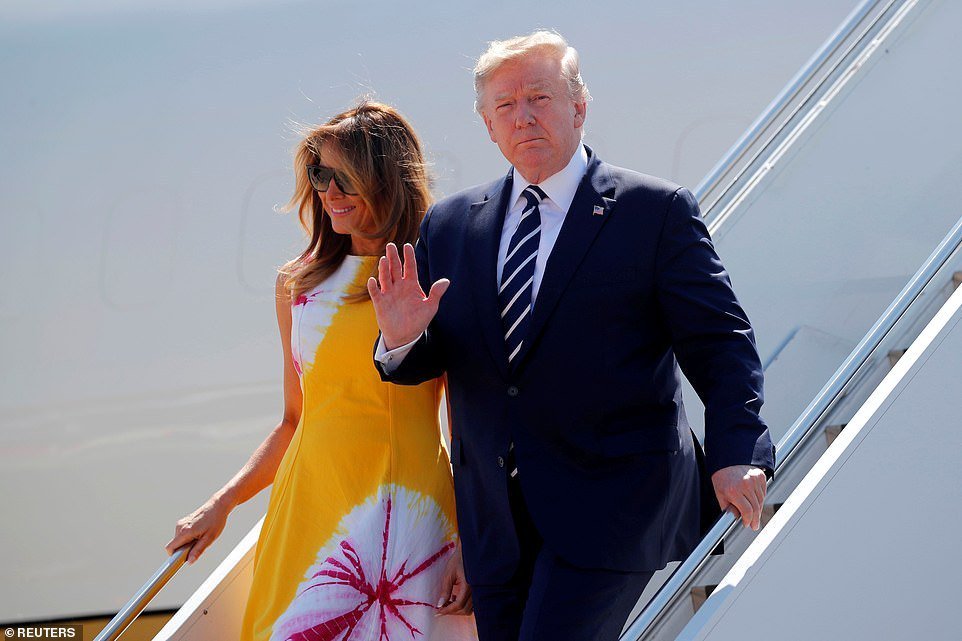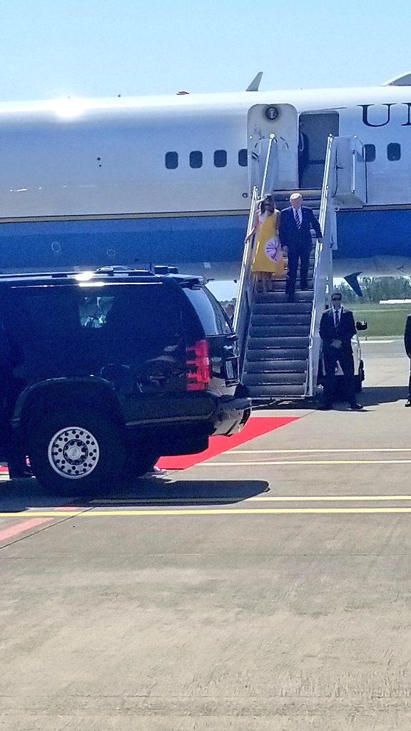 Первая леди США была в темных очках и в коктейльном желтом платье с рисунком. Она вышла с самолета после мужа и почти не улыбалась. Трампа и его жену встретил почетный караул и делегация, в составе которой была посол США во Франции Джейми Маккорт. После этого супруги Трамп сели в бронированный автомобиль и уехала.
