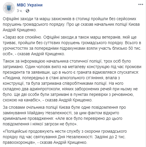 "Полицейские продолжают нести службу по охране общественного порядка во время празднования Дня Независимости. Задействованы до 2 тысячи правоохранителей", - отметил он.