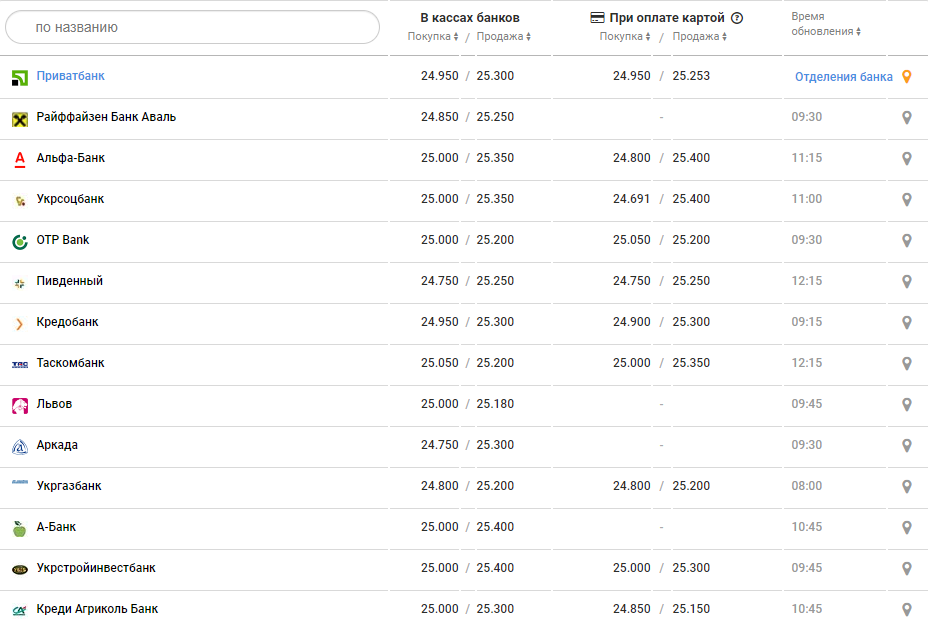 В банках курс доллара с утра был такой: покупка от 24,8 до 25 грн (покупка) и от 25,2 до 25,3 грн продажа.
