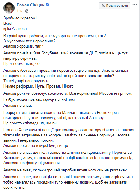 По его словам, Арсен Аваков саботировал и провалил переаттестацию в полиции, а также ответственен за провал реформы правоохранительных органов. Кроме того, Синицын упоминает, что Аваков, вероятно, знал о незаконной добыче янтаря, а также допустил побег из страны экс-бойцов "Беркута", которых подозревают в убийствах на Майдане.