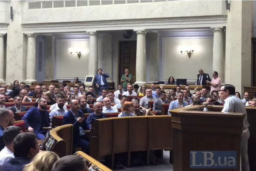 Отмечается, что в сессионный зал пришли почти в полном составе будущие нардепы фракции "Слуга народа", которые голосуют и на табло высвечивается цифра парламентского большинства для результативного принятия решений.