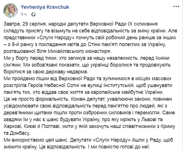 29 августа избранные народные депутаты от партии "Слуга народа" перед первым заседанием Верховной Рады ІХ созыва возложат цветы к Стене памяти павших за Украину на Михайловской площади. Об этом сообщает на своем Facebook руководитель пресс-службы политсилы Евгения Кравчук.