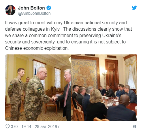 Советник президента США по национальной безопасности Джон Болтон заявил, что доволен встречами с коллегами из Украины и убежден в совместном видении безопасности Украины и угроз экономической эксплуатации со стороны Китая. Об этом Болтон написал в Twitter.
