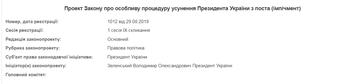 На официальной интернет-странице Рады указаны номер и дата регистрации законопроекта: № 1012, 29 августа 2019 года. Однако текст документа пока отсутствует.