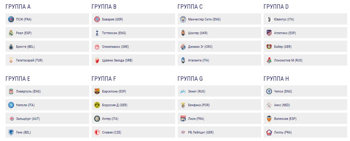 Состав всех групп Лиги чемпионов сезона 2019-2020: