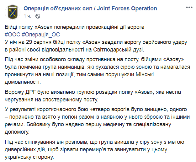 В ночь на 29 августа военные из полка "Азов" предупредили провокационные действия противника в районе своей ответственности на Светлодарской дуге. Об этом сообщает на Facebook пресс-служба Операции объединенных сил.