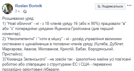 Политолог Руслан Бортник заявил, что в новом правительстве Гончарука нет "новых лиц", так как 90% министров работали с предыдущим Кабмином. Об этом он написал на своей странице в Facebook.