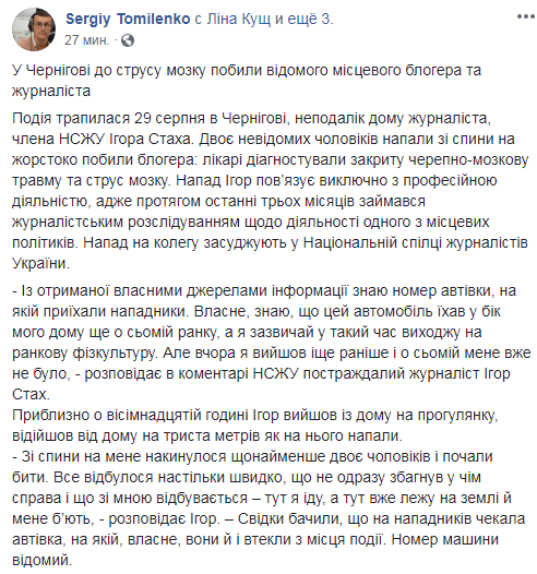 В четверг, 29 августа, в Чернигове до сотрясения мозга избили известного местного блогера и журналиста Игоря Страха. Нападение произошло недалеко от дома журналиста.