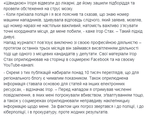 Нападение журналист связывает исключительно со своей профессиональной деятельностью – в течение последних трех месяцев он занимался освещением деятельности тогда еще одного из местных кандидатов в депутаты. Свои материалы Игорь Стах обнародовал на фб-странице и на своем YouTube-канале.