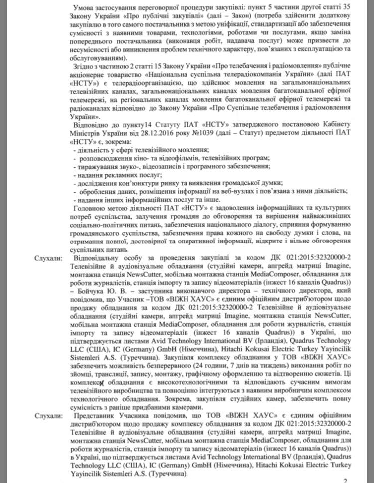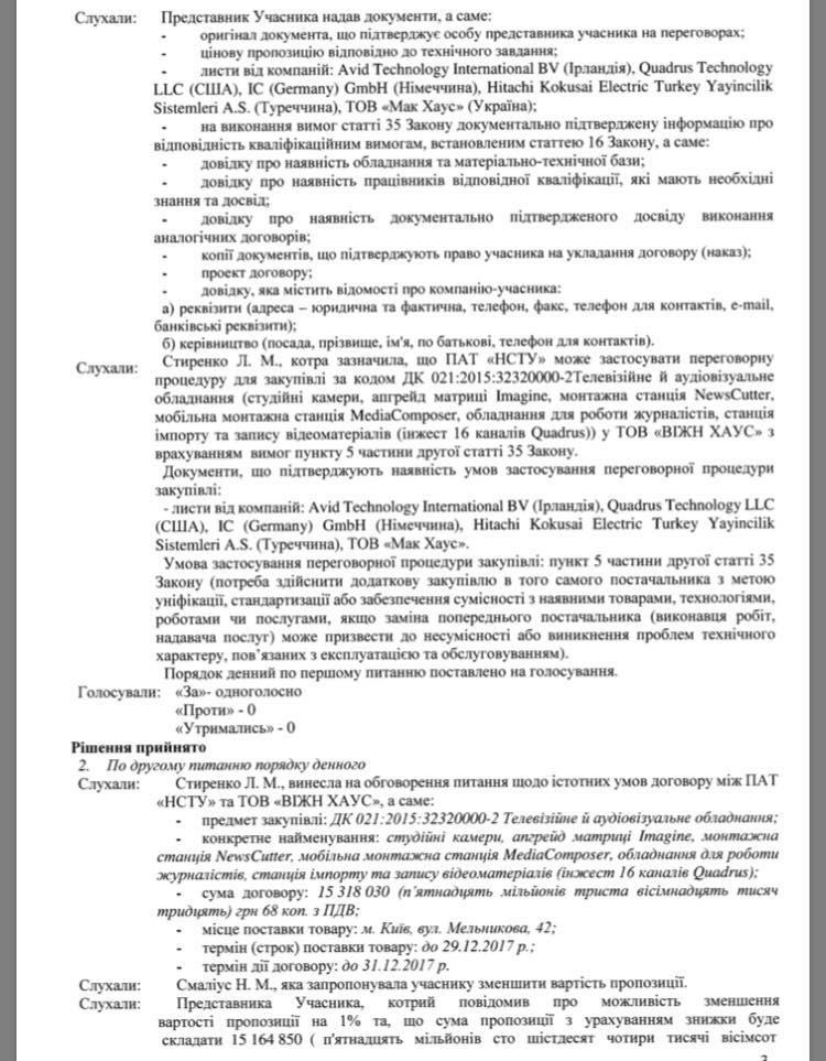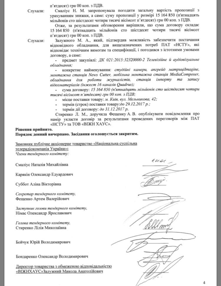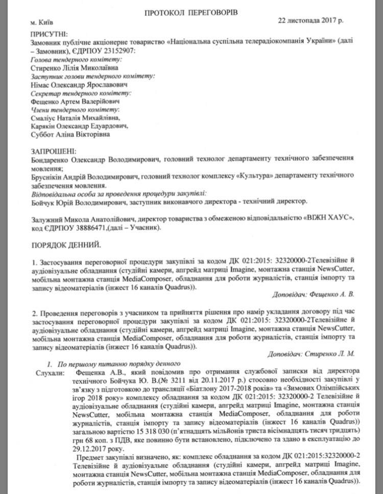 В нем записано: студийные камеры, апгрейд матрицы Image, монтажная станция NewsCutter, мобильная монтажная станция MediaComposer и прочее оборудование общественный вещатель решил приобрести для обеспечения качественной трансляции этапа Кубка мира по биатлону и Олимпийских Игр в Пхечхане. Причем "ВижнХаус" является единственным официальным дистрибутором данной техники в Украине (ранее компания Залужного участвовала в проведении на украинской земле Евровидения-2017). В итоге, все члены тендерного комитета НОТУ одобрили контракт с поставщиком, который параллельно согласился снизить изначальную цену на свои услуги на 1%.
