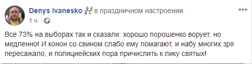 "Все 73% на выборах так и сказали: хорошо Порошенко ворует, но медленно! И конон со свином слабо ему помогают, и НАБУ многих зря пересажало, и полицейских пора причислить к лику святых!", - написал он.