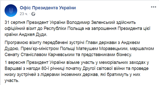 Завтра, 1 сентября президент Украины примет участие в мемориальных мероприятиях в Варшаве по случаю 80-й годовщины начала Второй мировой войны. Также в воскресенье он проведет несколько встреч с лидерами иностранных государств, которые примут участие в памятных торжествах.