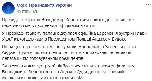По результатам встреч состоится совместная пресс-конференция Зеленского и Дуды для представителей украинских, польских и иностранных СМИ.