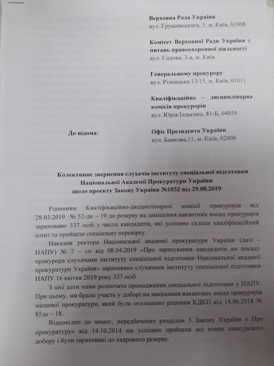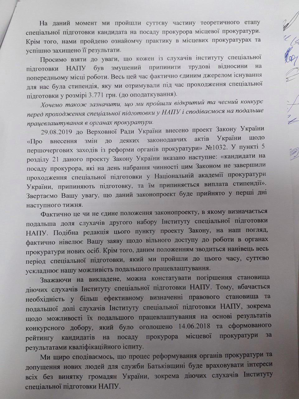 Также протестующие написали официальное письмо-обращение к президенту Украины, в парламент, профильный комитет, квалификационно-дисциплинарную комиссию прокуроров, народному депутату Артему Дмитруку, а также к новоназначенному генеральному прокурору Украины Руслану Рябошапке.