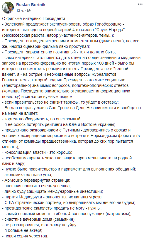 Политолог Руслан Бортник считает, что выпуском этого фильма в Зе-команде попытались избежать пресс-конференции. Также он выделил главные тезисы Зеленского: