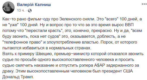 "Как-то рано фильм-оду про Зеленского сняли. Это "всего" 100 дней, а не "уже" 100 дней. Ну и вопрос про то что за это время вырос ВВП потому что "перестали красть", это, конечно, прекрасно. Ну и да, "всем буду звонить, пока нет судов" это, оказывается, доблесть, а не "телефонное право" и злоупотребление властью. Порок, от которого пытаются избавиться в нормальных странах.
