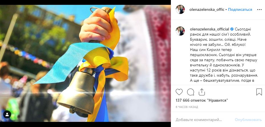 Отвел сына в первый клсс президент Украины Владимр Зеленский. Его жена Елена написала в Instagram: "Сегодня день для нашей семьи особенный. Букварик, тетради, карандаши. Будто ничего не забыли... Ой, яблоко! Наш сын Кирилл теперь первоклассник. Сегодня он впервые сядет за парту, увидит свою первую учительницу и одноклассников. В последующие 12 лет он узнает, что такое дружба и, пожалуй, разочарование. А еще - будет хулиганить, поедет в первые путешествия без родителей, закалять характер и становиться ответственным...". Фото сына она не выложила, запостив вместо этого снимок с колокольчиком.