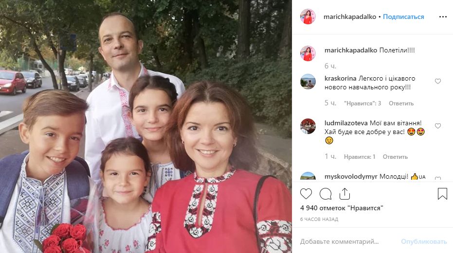 Телеведущая канала 1+1 и супруга Маричка Падалко запостила снимок с тремя детьми-школьниками в вышиванках и с мужем - экс-нардепом Егором Соболевым. "Полетели!!!" - подписала она фото. Ее сыну Мише - 12 лет, дочке Маше - 11 лет, дочке Кате - 9 лет.