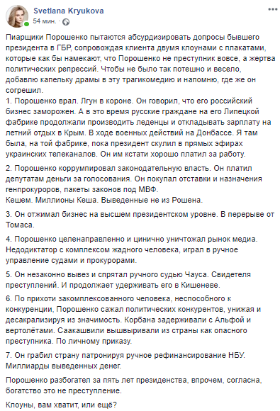 "Пиарщики Порошенко пытаются абсурдизировать допросы бывшего президента в ГБР, сопровождая клиента двумя клоунами с плакатами, которые как бы намекают, что Порошенко не преступник вовсе, а жертва политических репрессий. Чтобы не было так потешно и весело, добавлю капельку драмы в эту трагикомедию и напомню, где же он согрешил.
