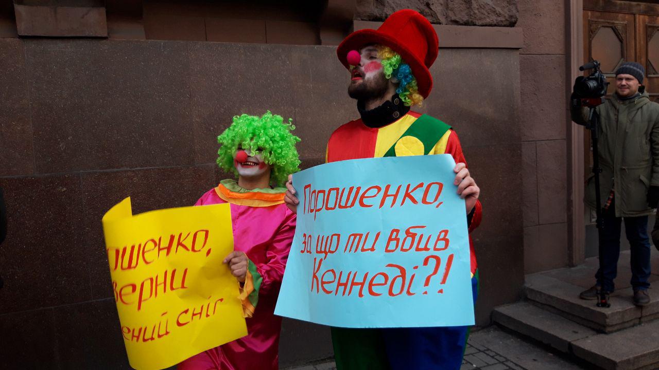 10:42 Пришли двое человек в костюмах клоунов с плакатами "Порошенко - на нары"