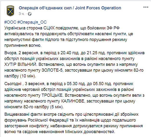 По словам пресс-службы, боевики активизировались еще вчера. Вечером 2 сентября противник обстрелял позиции украинских сил в районе населенного пункта Хутор Вольный. При этом применялись минометы 82-го калибра.