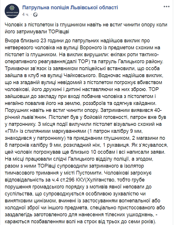 Вчера около 23 часов патрульным поступил вызов. Заявитель рассказал, что на улице Вороного замечен нетрезвый мужчина с предметом, похожим на пистолет с глушителем. На вызов отправились экипаж роты тактико-оперативного реагирования (ТОР) и патруль Галицкого района.