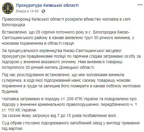 "Установлено, что 28 августа текущего года в с. Белогородка Киево-Святошинского района в канаве обнаружен труп 35-летнего киевлянина, с ножевым ранением в области сердца", - говорится в сообщении.