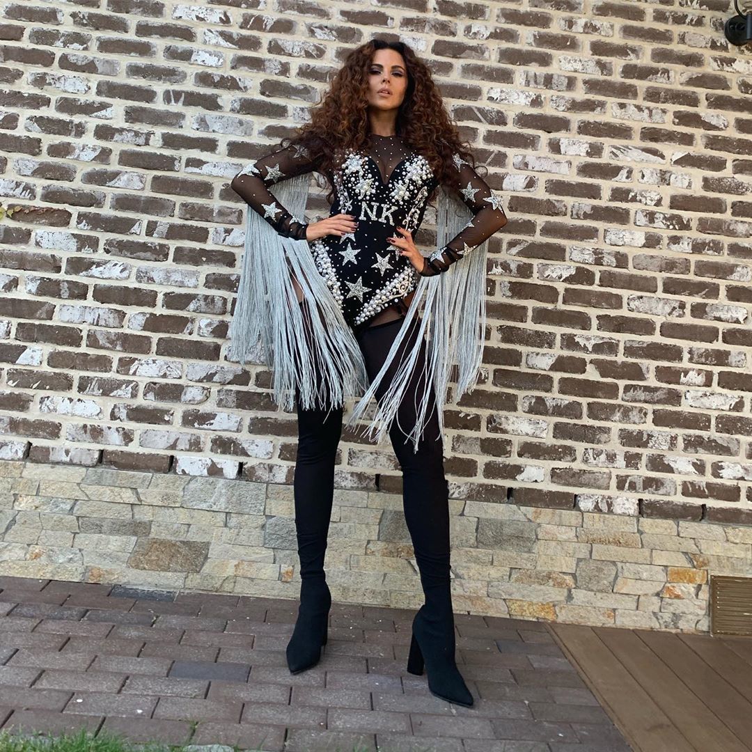 "Как вам мой новый образ?", - подписала снимок певица. Боди - продукт собственного бренда певицы - NK. Его плечи украшает блестящая бахрома. Комплект дополняет концертная фуражка, расшитая жемчужинками.