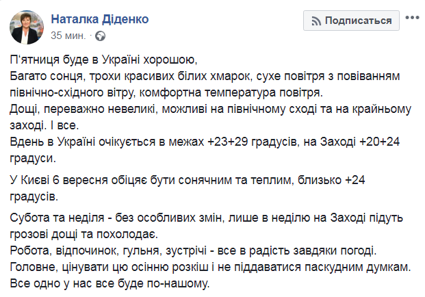 Последний рабочий день недели выдастся очень теплым для осени, солнечным и сухим. Об этом сообщает на своем Facebook синоптик Наталья Диденко.